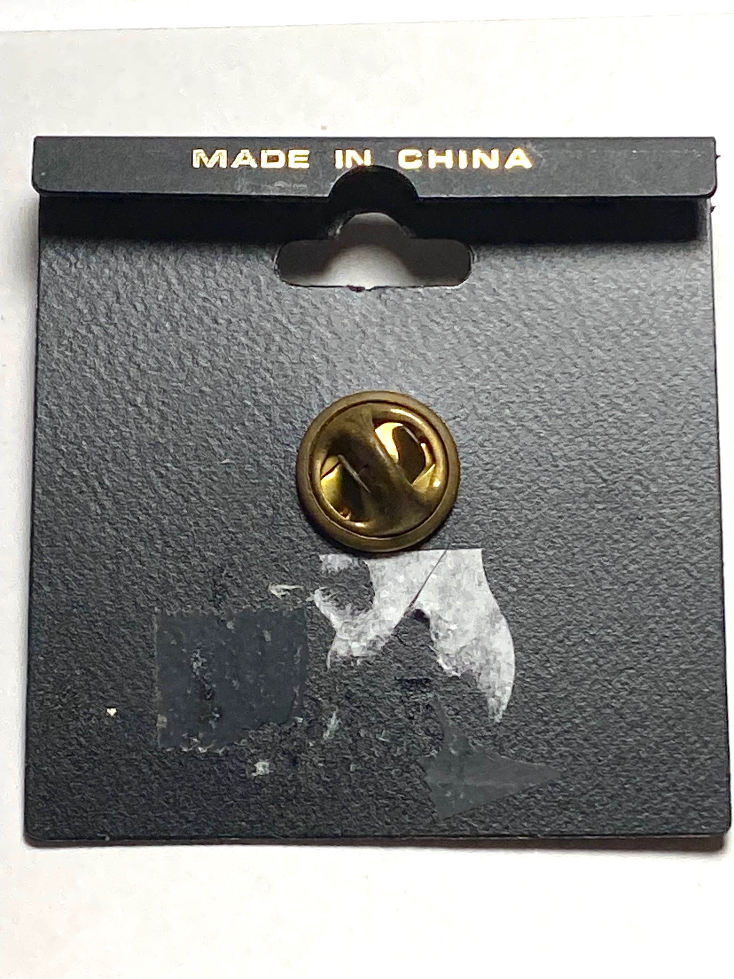 This item was packaged by us and is on a plastic black back. There is residue from a price sticker on the back as well; the pin itself is awesome.